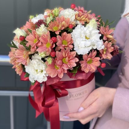 Коробка Робкий поцелуй из роз сорта квинси, охара, эустомы, генисты и диантуса