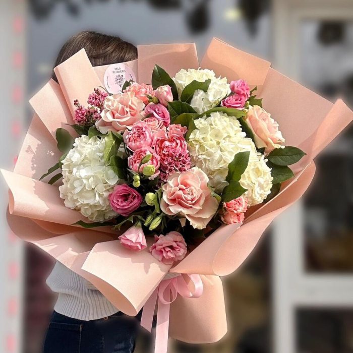 “Эвкалиптическая роскошь” гортензия и пионовидная кустовая роза