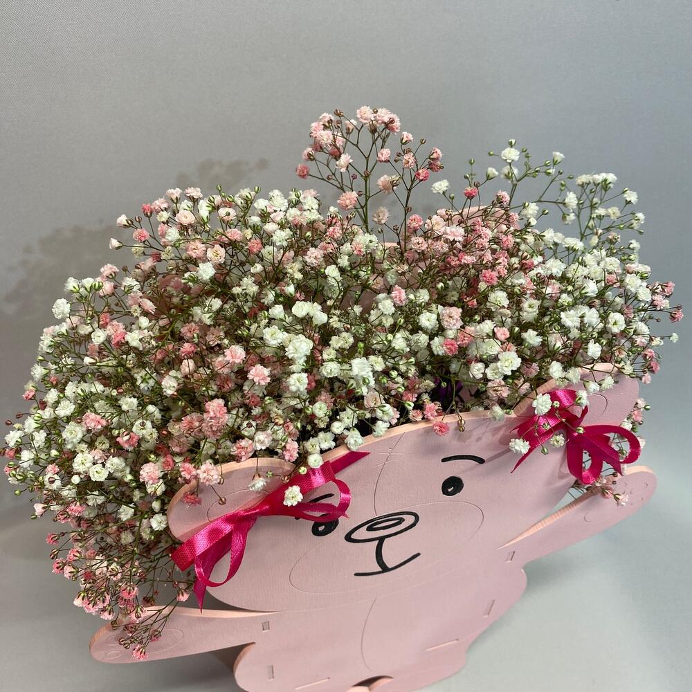 гипсофила радужная – 7 шт.Ящик деревянный – 1 шт.Оазис флористический – 1 шт.