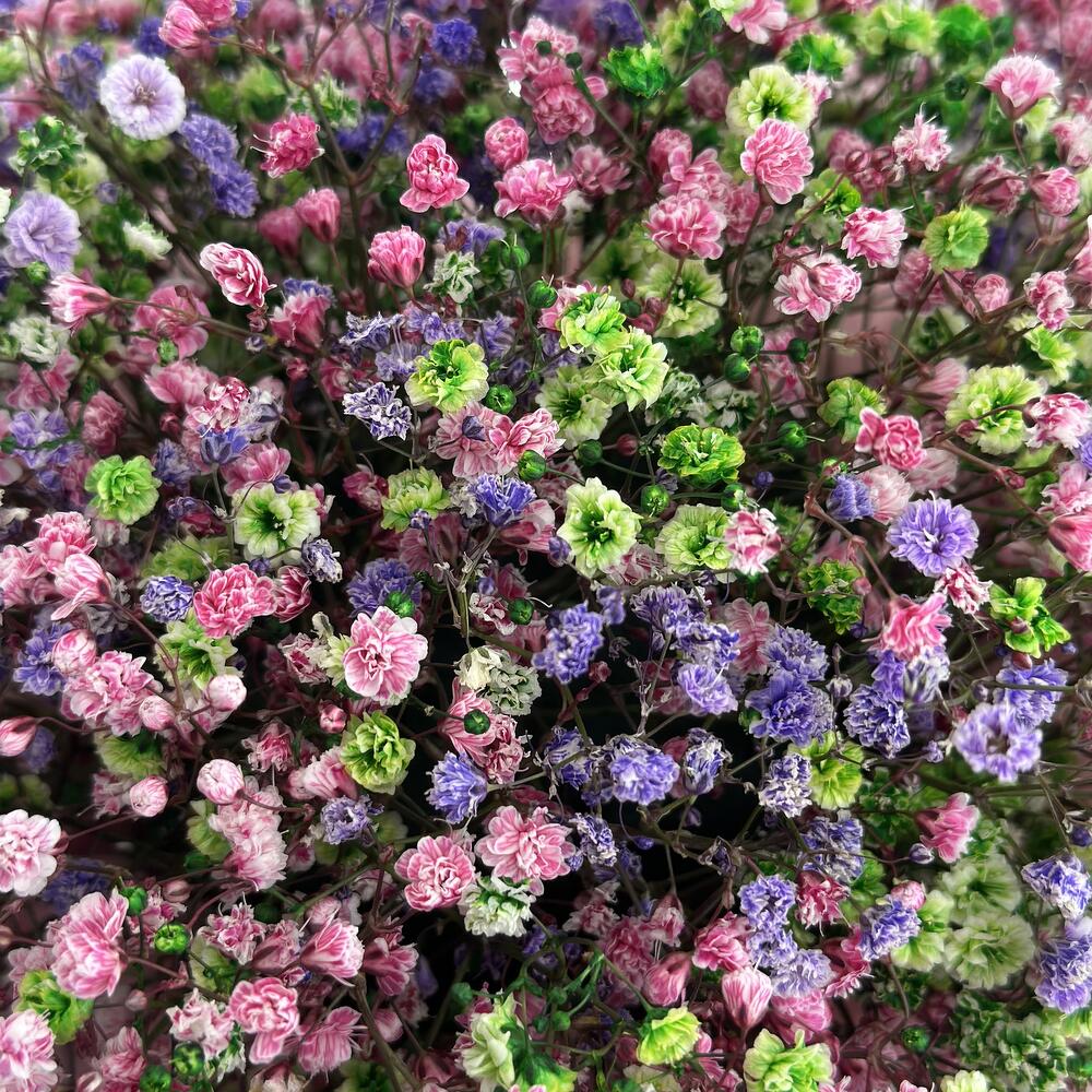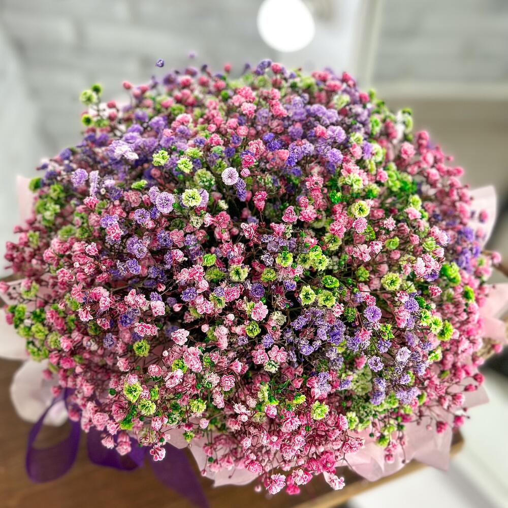 Тишью – 2 шт.Кашпо плетеное – 1 шт.Открыточка с вашими пожеланиями – 1 шт.Оазис флористический – 1 шт.подкормка для срезанных цветов – 1 шт.инструкция по уходу за цветами – 1 шт.гипсофила радужная – 9 шт.