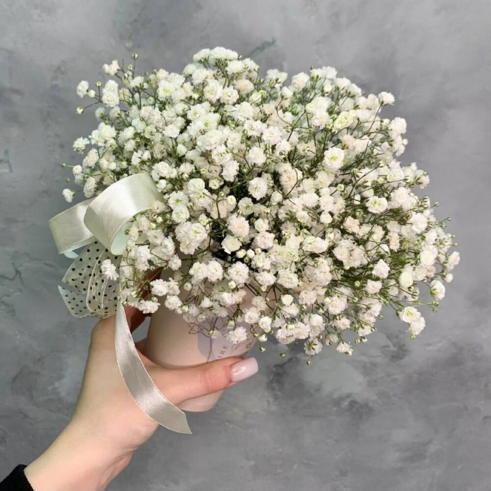 Стаканчик с гипсофилой – отличный вариант презента или дополнения к основному подарку, или просто без повода)Небольшую композицию удобно разместить дома, на работе, так как не требуется ваз)Стаканчик будет долго радовать своей красотой и нежностью и дарить только положительные эмоции