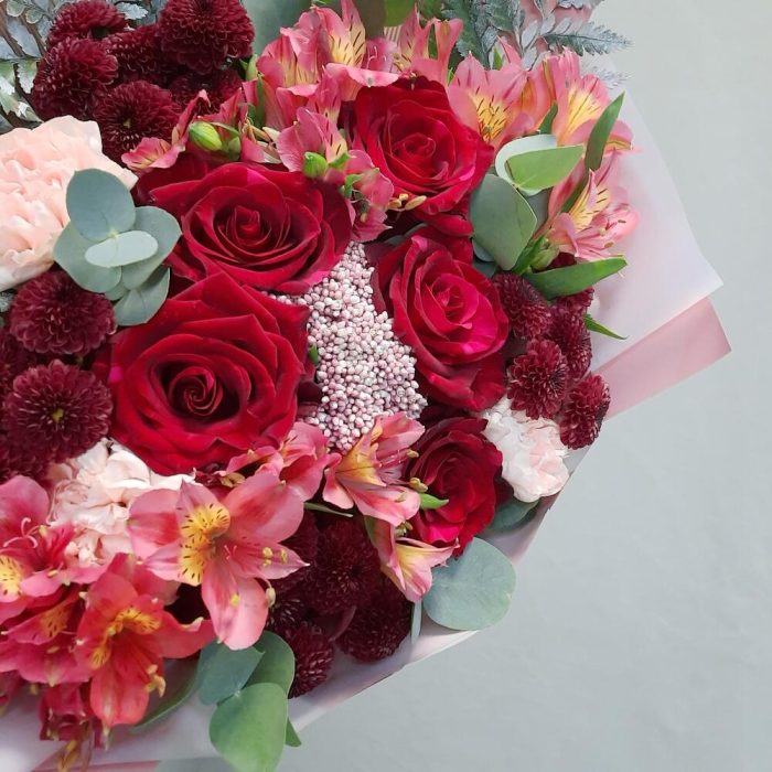 Роза – 5 шт.Альстромерия – 4 шт.Сантини – 4 шт.Диантус – 4 шт.Озотамнус – 1 шт.Эвкалипт – 3 шт.Упаковка дизайнерская – 3 шт.Лента атласная – 1 шт.