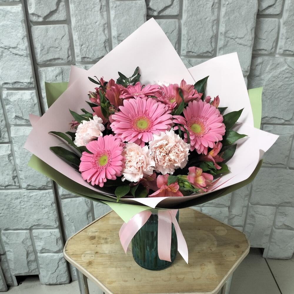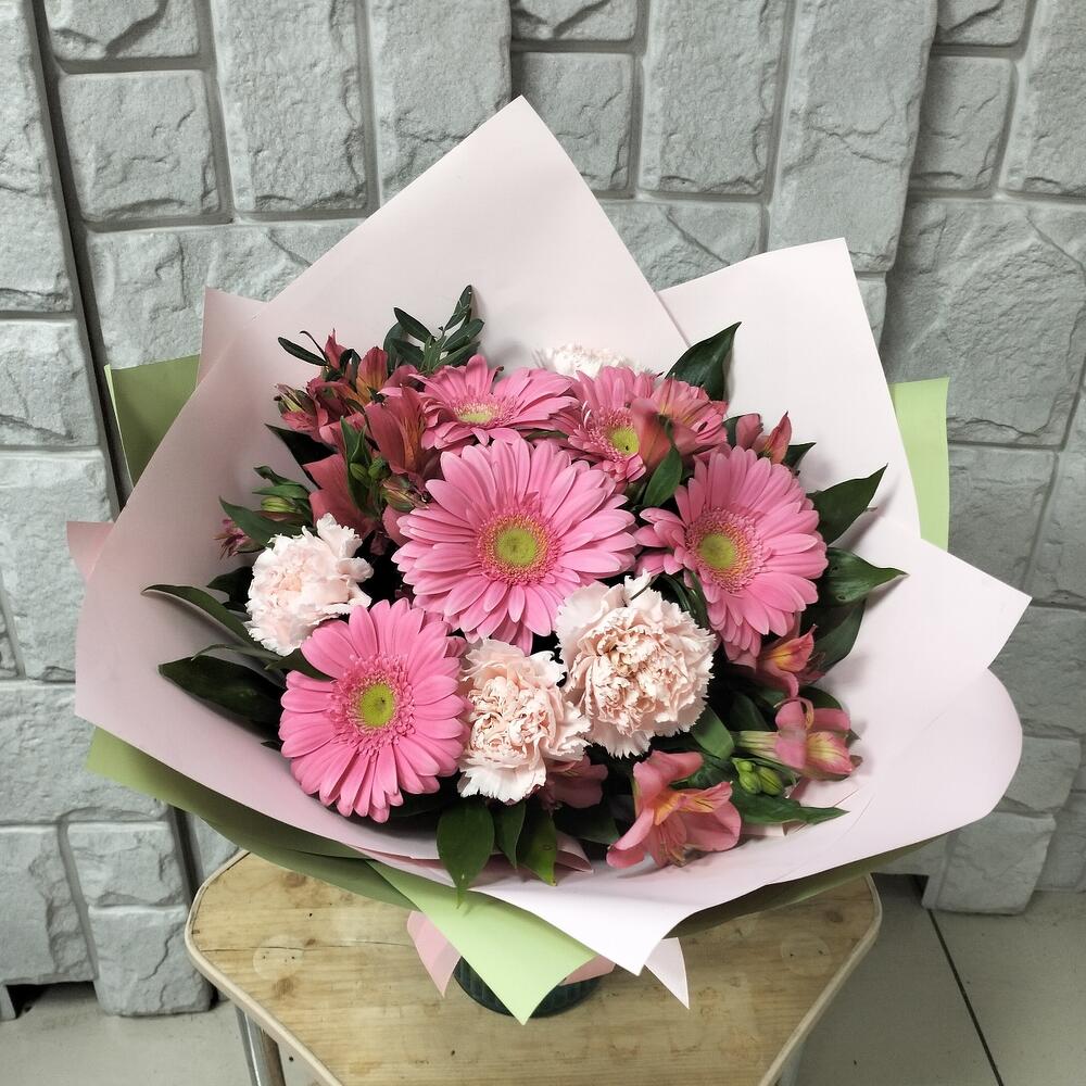 Упаковка – 2 шт.Лента атласная – 1 шт.Гвоздика сортовая – 4 шт.Альстромерия Микс Европа – 3 шт.гербера стандарт – 5 шт.
