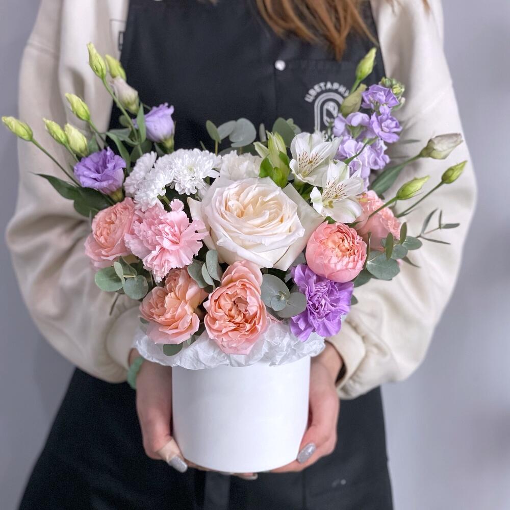 кустовые пионовидные розы – 2 шт.Лизиантус – 1 шт.Маттиола – 1 шт.Пионовидная роза – 1 шт.Альстромерия – 1 шт.Гвоздика – 3 шт.Сантини – 1 шт.шляпная коробка с надписью – 1 шт.