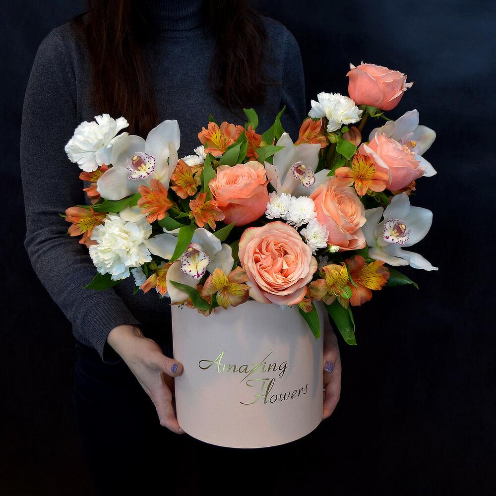 Альстромерия – 11 шт.Хризантема – 3 шт.орхидея – 5 шт.Большая шляпная коробка – 1 шт.пионовидные розы – 5 шт.диантусы – 5 шт.