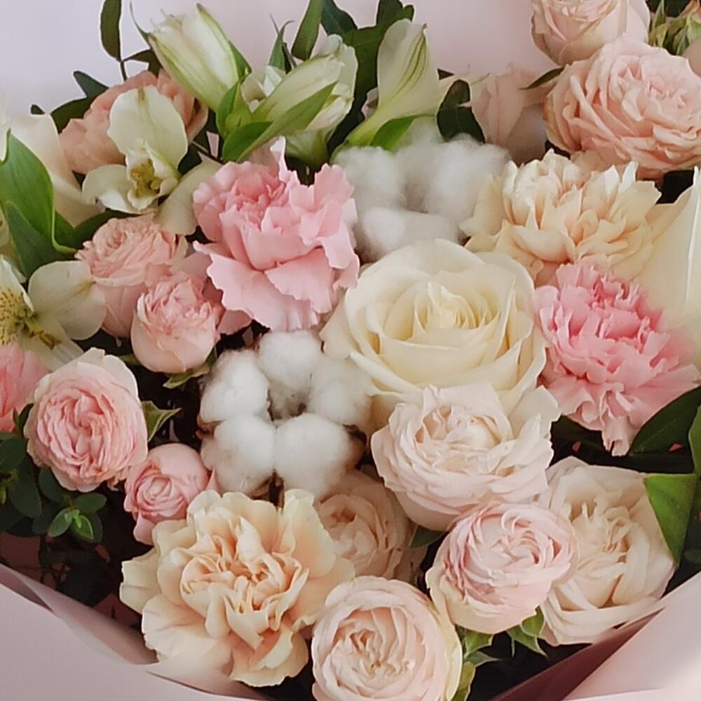 Гвоздики, Пионовидные розы, Розы