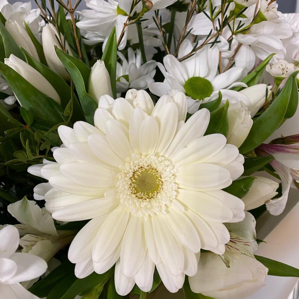 Букет с тюльпанами, герберами, альстромерией и хризантемой ромашка «Ванильная весна»