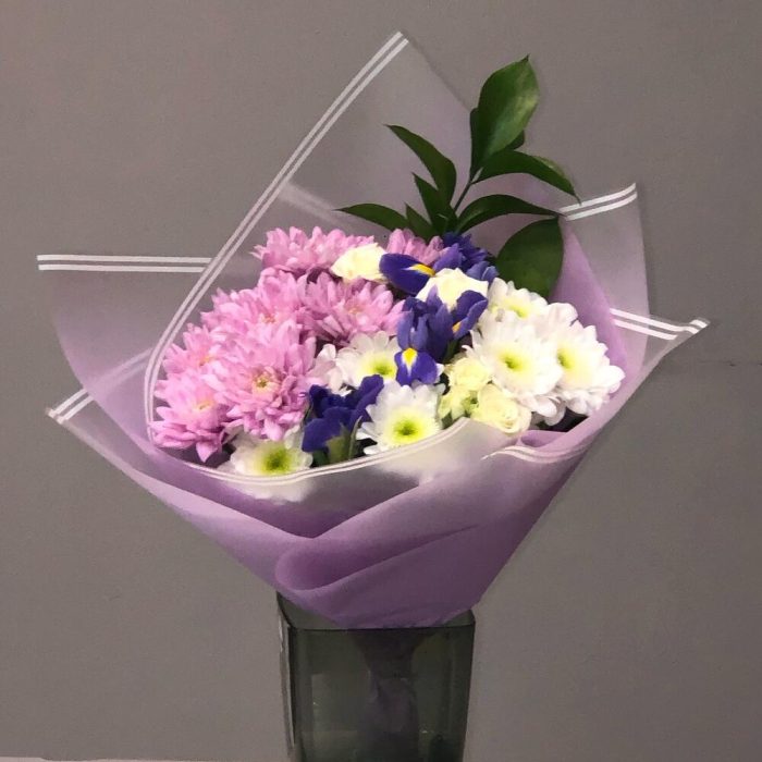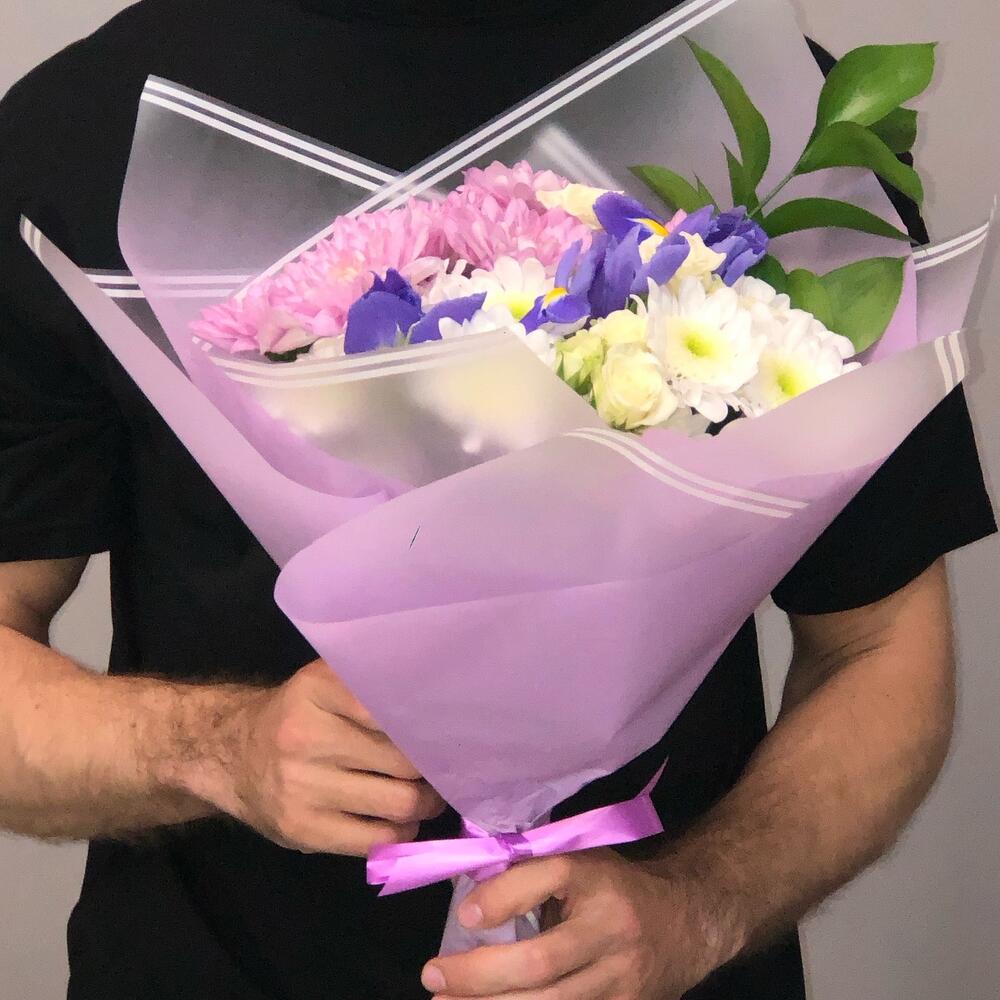 Ирис – 4 шт.микс хризантем – 3 шт.Лизиантус – 2 шт.листики – 3 шт.Упаковка – 1 шт.