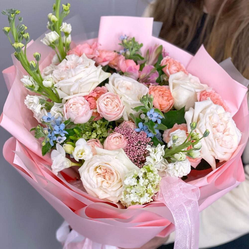 ароматные розы white o’hara – 5 шт.Незабудки – 3 шт.кустовые пионовидные розы – 3 шт.Кустовая роза – 1 шт.Маттиола – 3 шт.Альстромерия – 1 шт.Озотамнус – 1 шт.Фрезия – 1 шт.Вибурнум – 1 шт.Фисташка – 2 шт.Упаковка дизайнерская – 1 шт.
