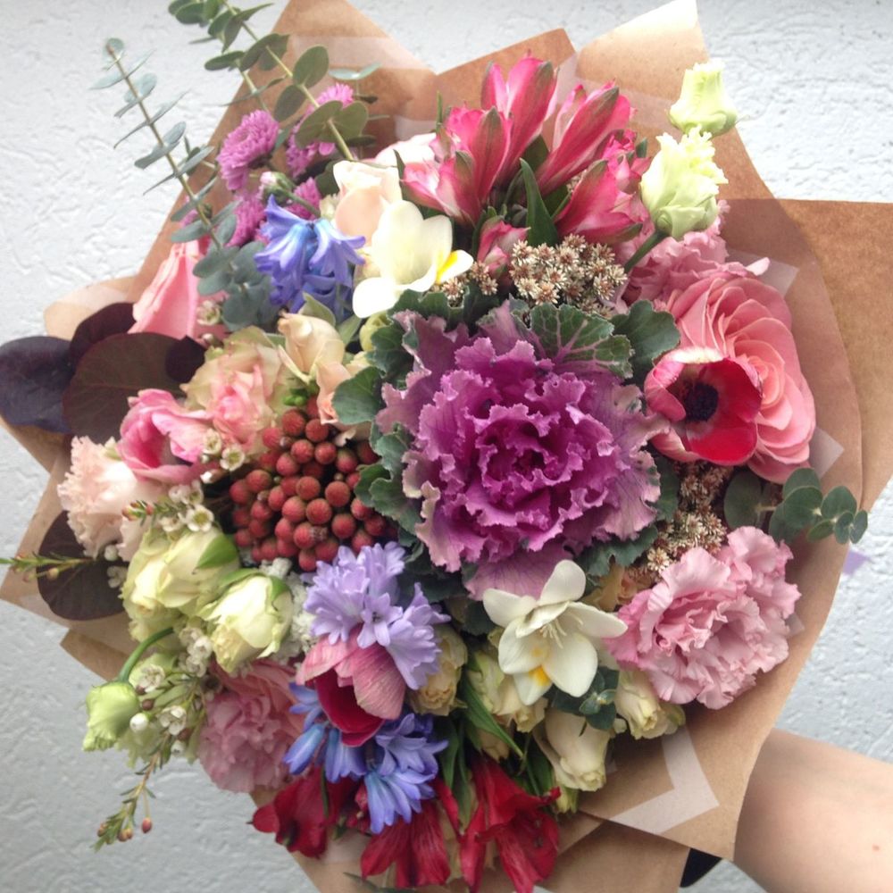 Брассика – 1 шт.Гиацинт голубой – 3 шт.Лизиантус Алиса белый – 1 шт.Альстромерия Микс Европа – 3 шт.Капс Бруния Ред – 1 шт.Роза кустовая – 1 шт.