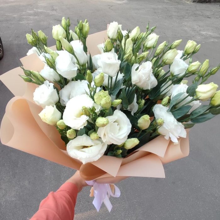 Красивый букет белоснежных эустом, оформленный во флористическую кальку светлых оттенков.