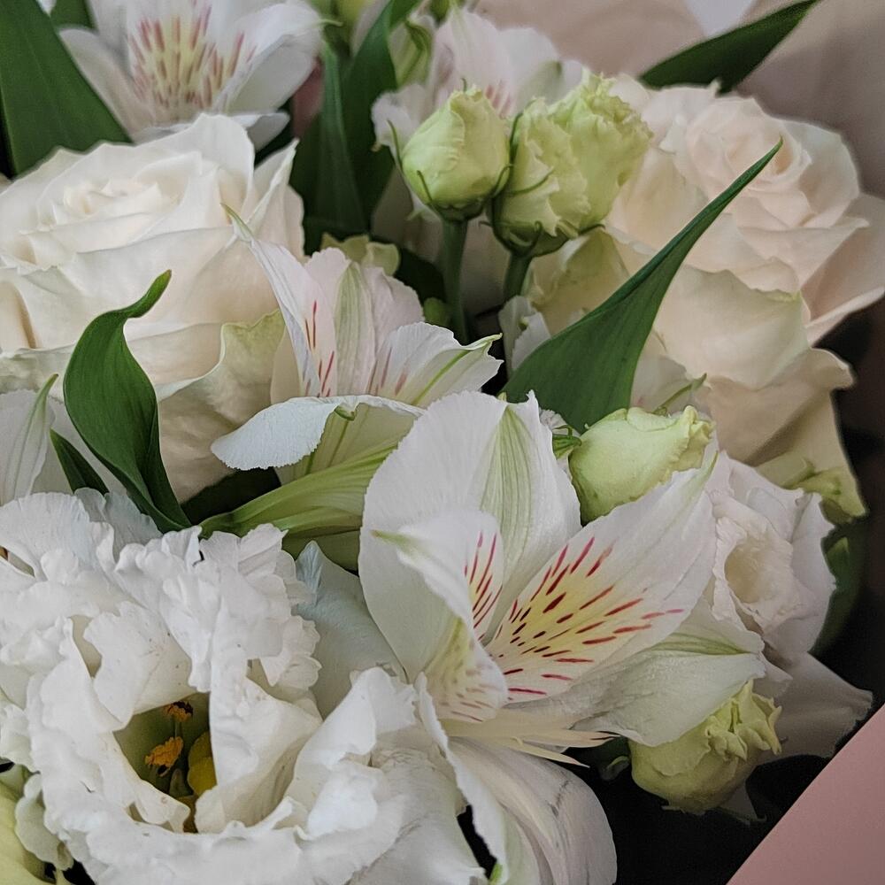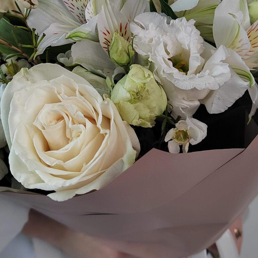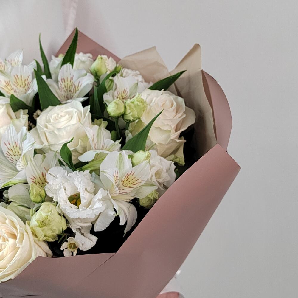 Сборный букет с белыми розами, белоснежной эустомой, стойкой альстромерией в стильной корейской упаковке