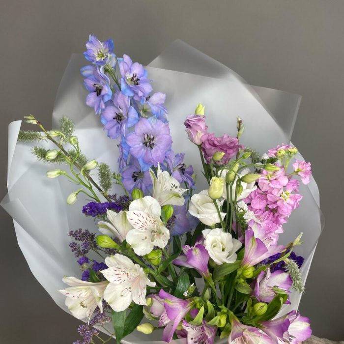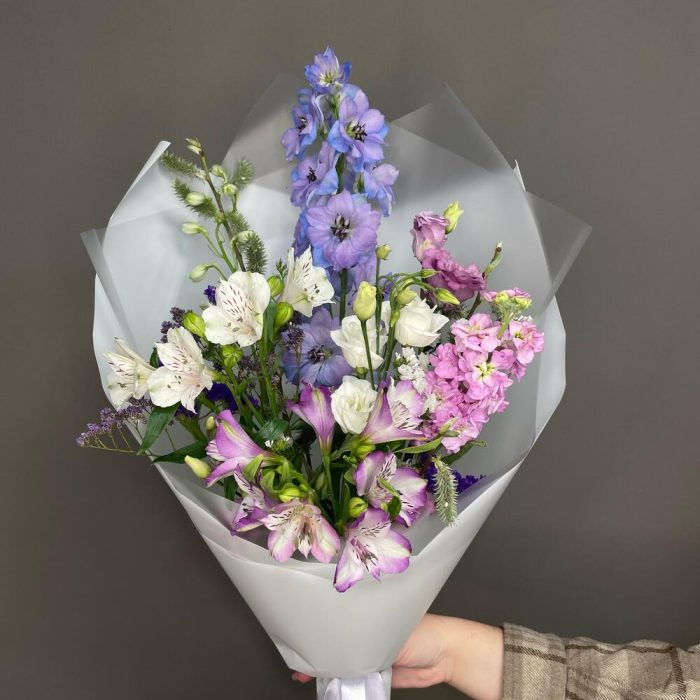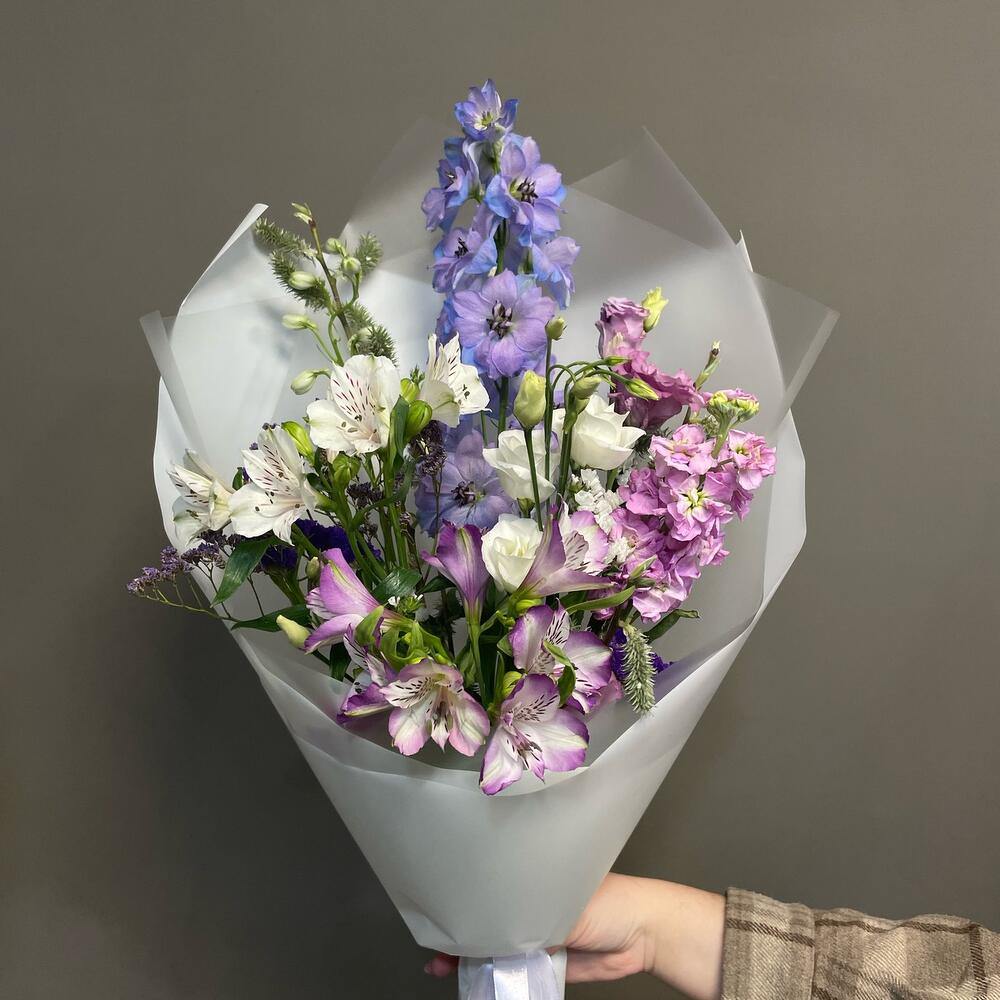 Альстромерия – 3 шт.Верба – 1 шт.Дельфиниум – 1 шт.Лизиантус – 2 шт.Маттиола – 1 шт.Статица – 2 шт.Эустома – 3 шт.Лента атласная – 1 шт.Упаковка дизайнерская – 1 шт.