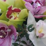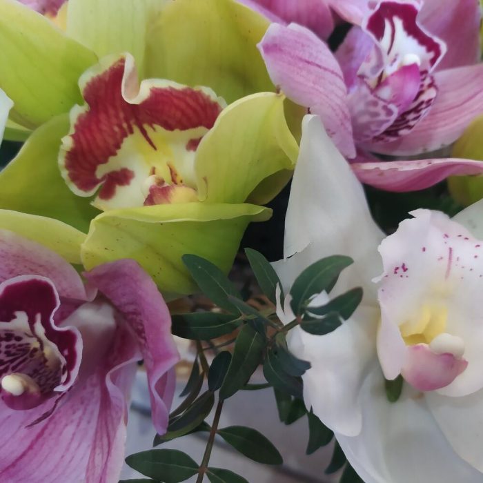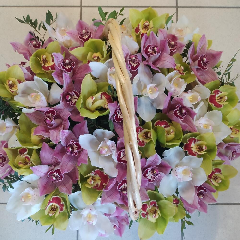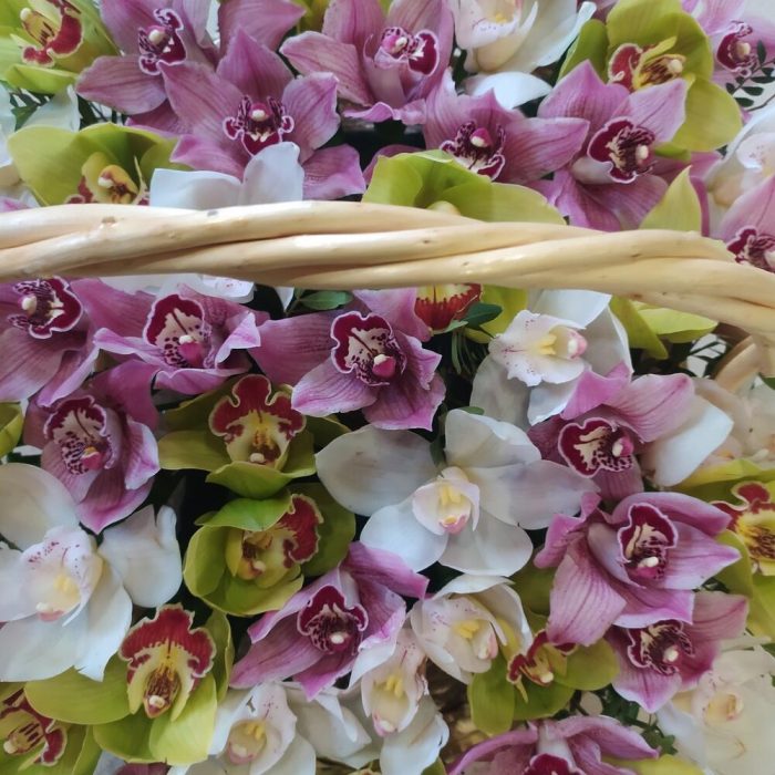 Орхидея Цимбидиум ветка – 5 шт.Фисташка – 5 шт.Корзина плетеная – 1 шт.Оазис флористический – 3 шт.