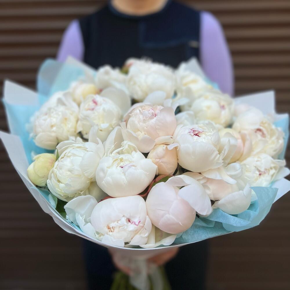 Лента – 2 шт.Тишью – 3 шт.Дизайнерская упаковка – 3 шт.пион белый премиум – 25 шт.