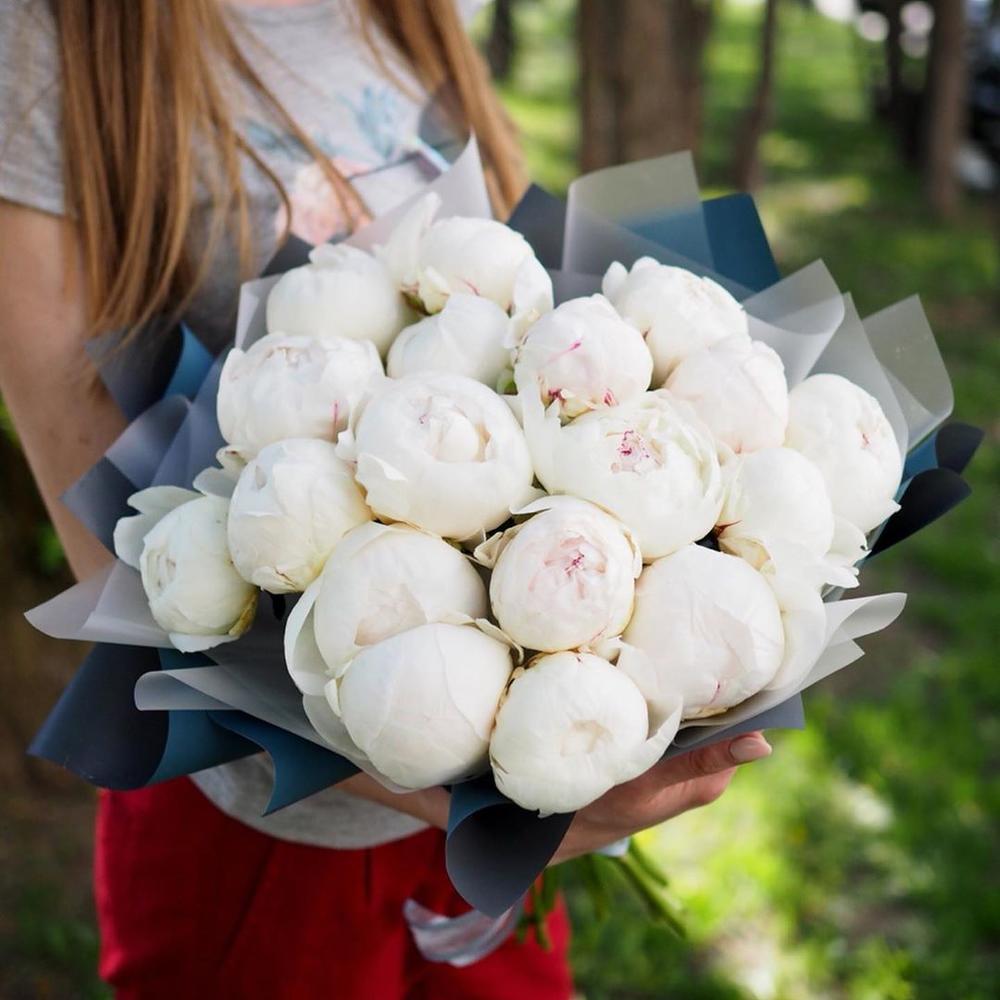 Букет из 19 белых пионов в дизайнерской упаковке “Эльза Сасс”