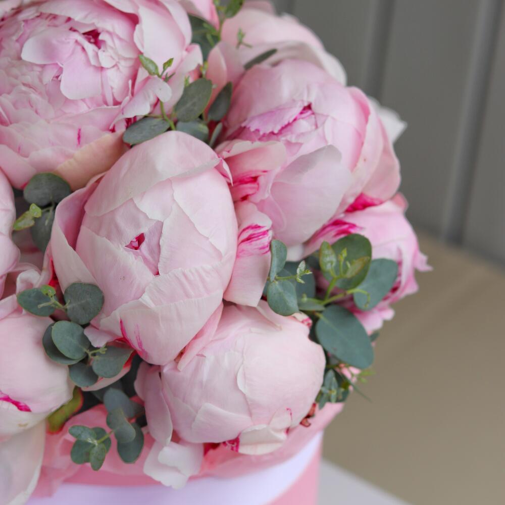 Пион – 13 шт.Эвкалипт – 2 шт.Шляпная коробка – 1 шт.Шоколадка – 1 шт.открытка с вашими пожеланиями – 1 шт.
