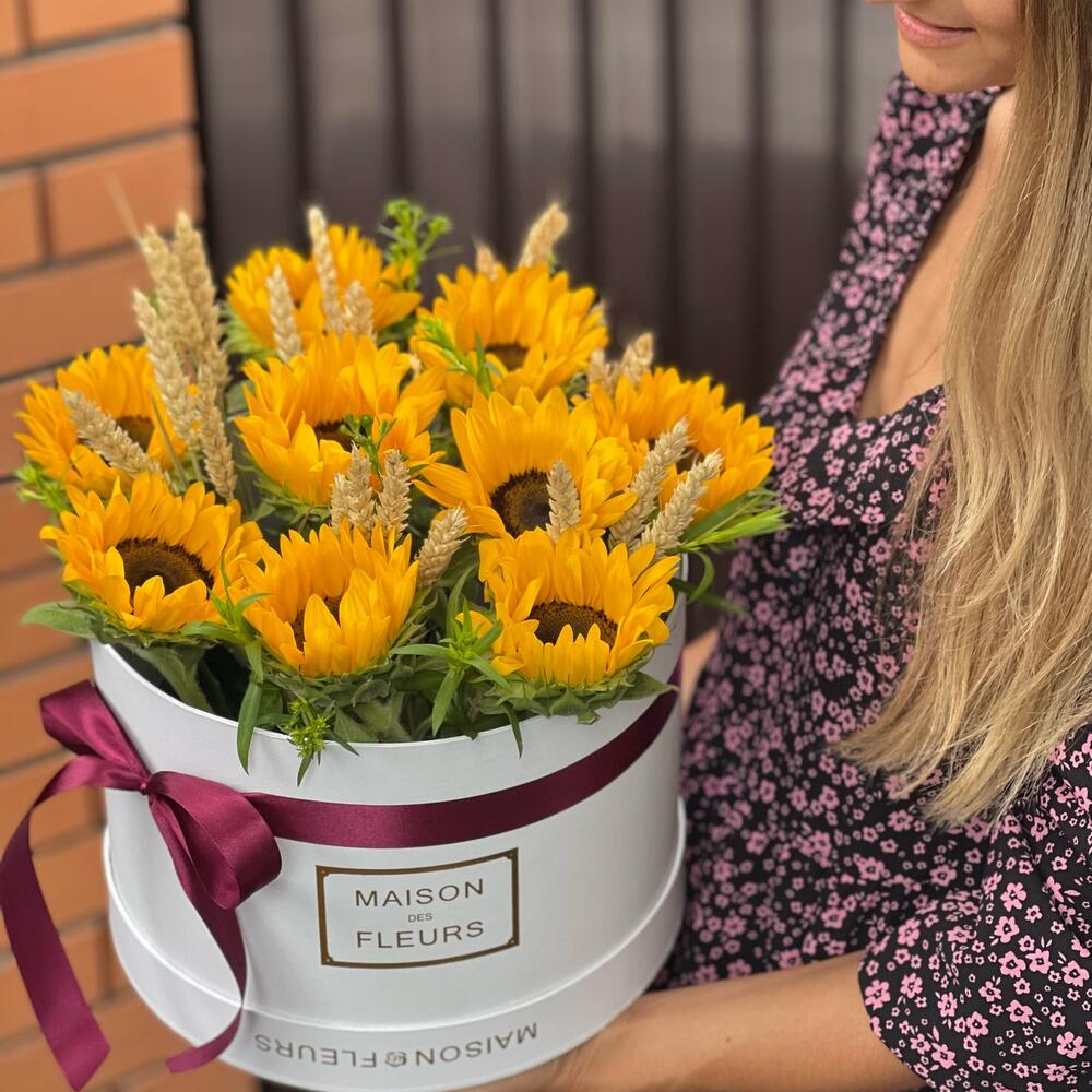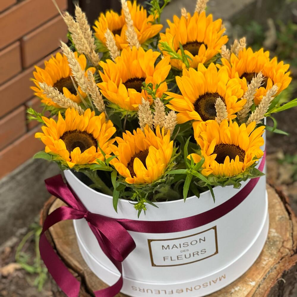Чудесная композиция в коробке из подсолнухов и декоративными колосками