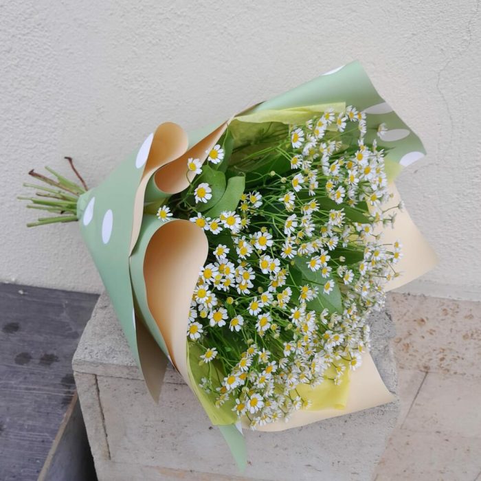 Салал – 5 шт.Лента атласная – 2 шт.Упаковка дизайнерская – 3 шт.матрикария (полевая ромашка) – 15 шт.