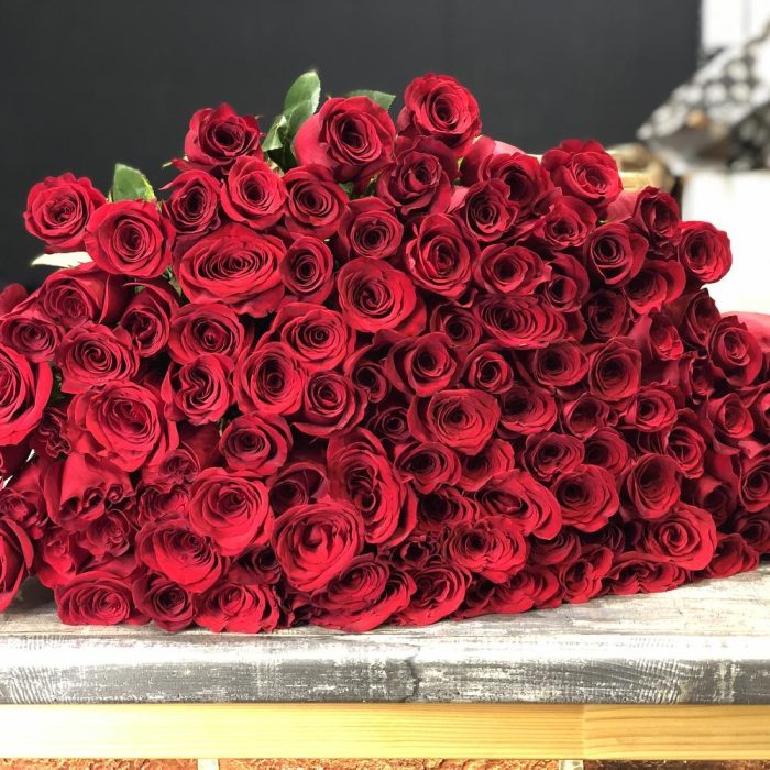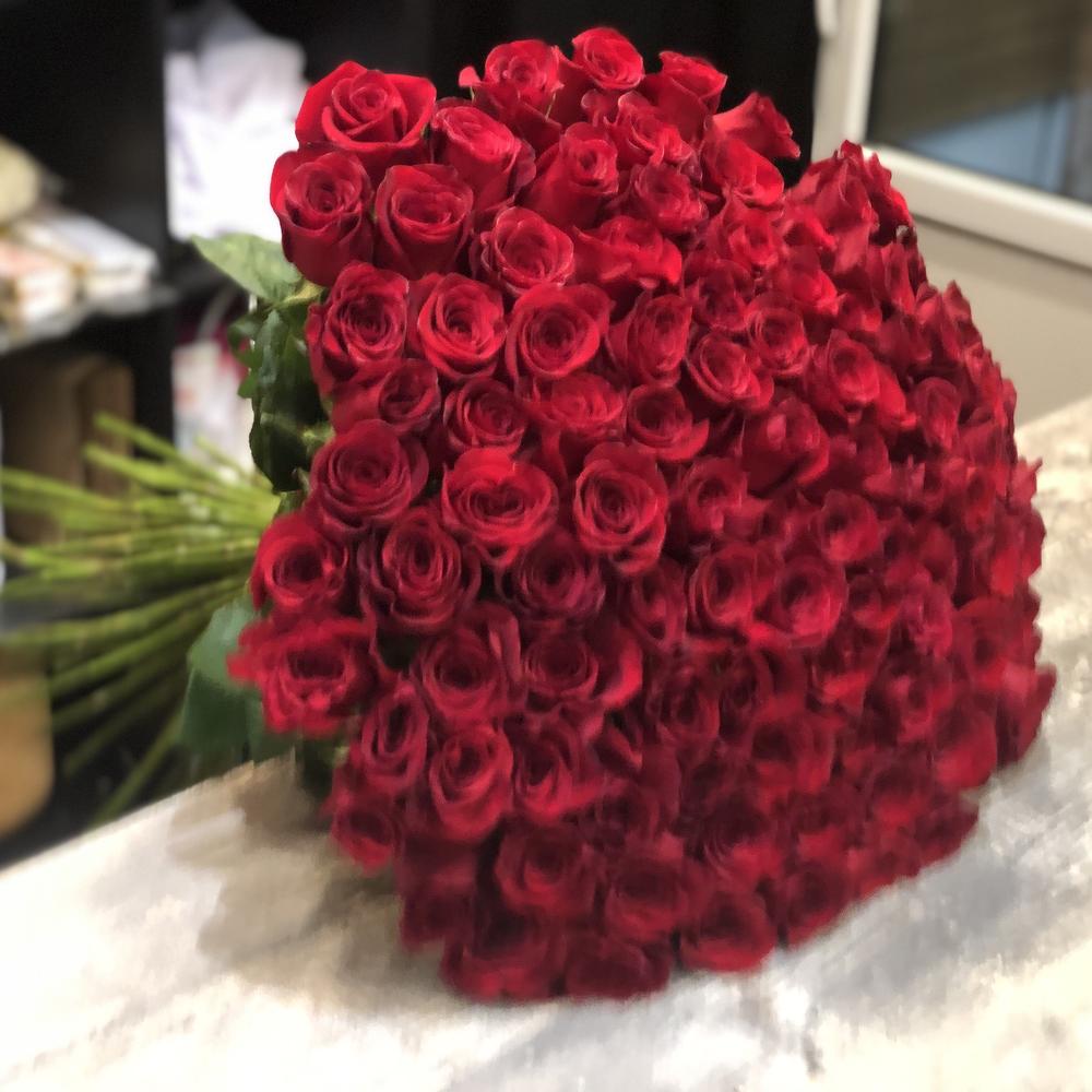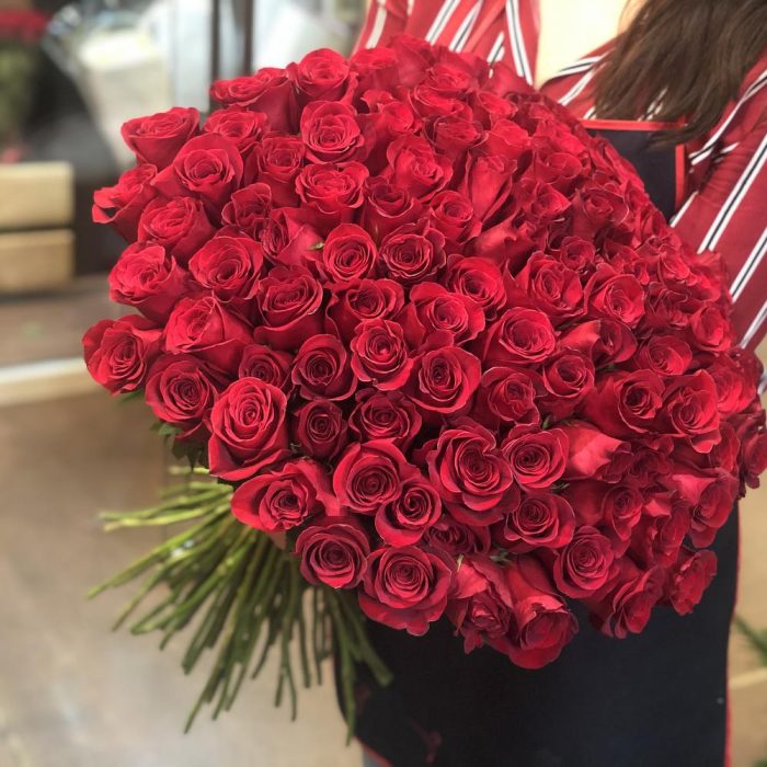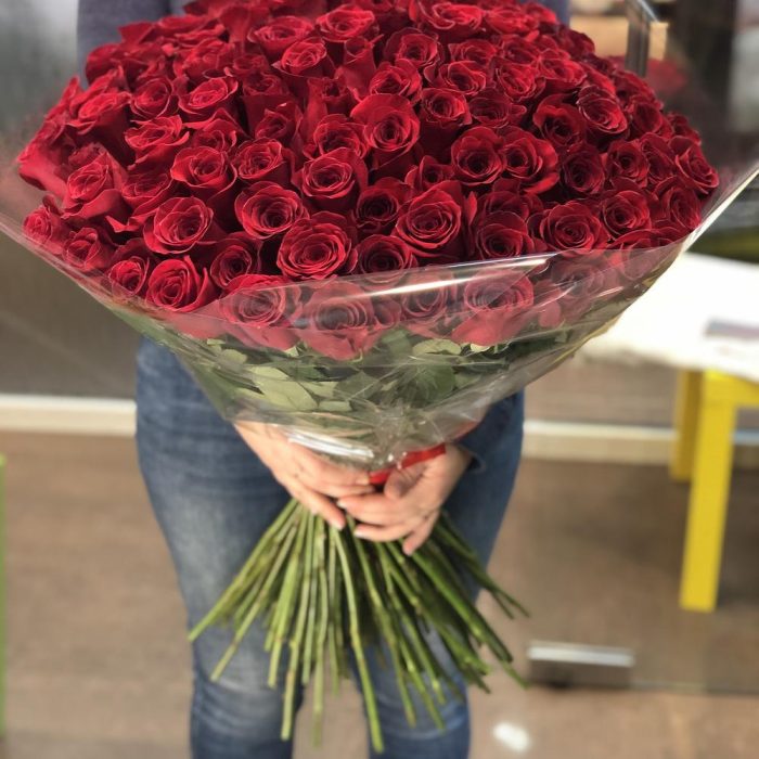 Роза красная Эквадор – 101 шт.Пленка прозрачная – 1 шт.Лента атласная – 1 шт.