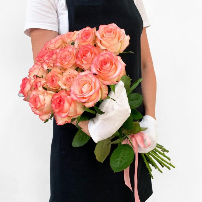 Нежный букет из бело-розовых роз Джумилия с атласной лентой – это мега крутая возможность порадовать свою вторую половинку красивым букетом свежих роз.