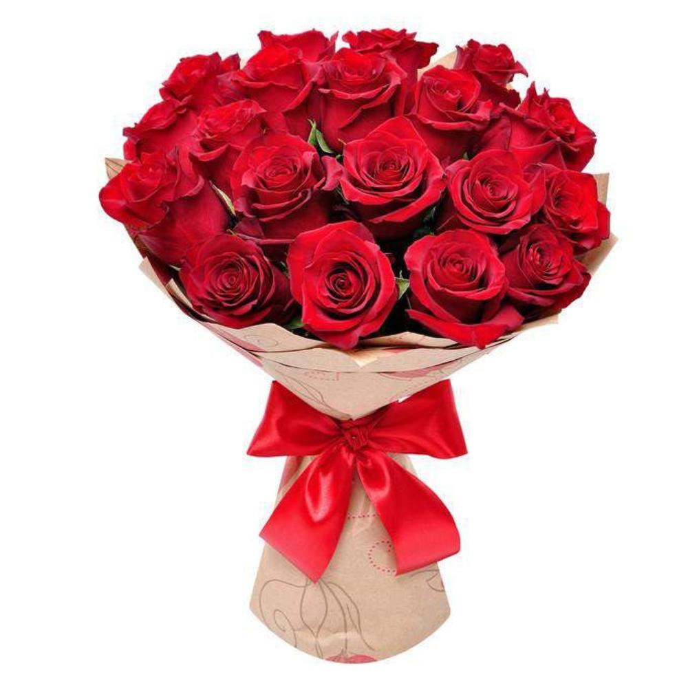 Атласная лента – 1 шт.Красная роза 50 см – 21 шт.Крафт упаковка – 1 шт.