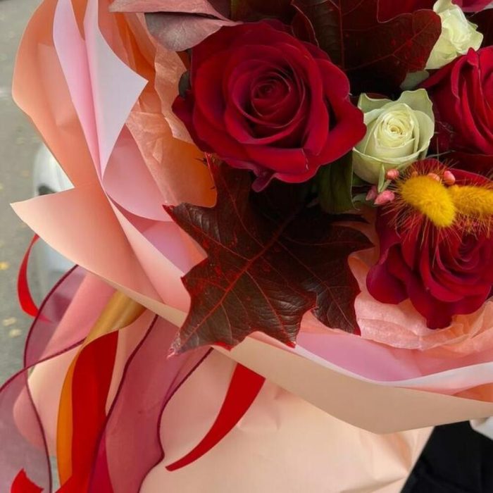Альстромерия – 3 шт.Гиперикум – 2 шт.Калла – 1 шт.Лента – 4 шт.Роза красная – 5 шт.Роза кустовая – 3 шт.Тишью – 4 шт.Пленка – 2 шт.Сухоцветы – 3 шт.Листья Дуба – 3 шт.Лагурус – 5 шт.роза белая кения – 4 шт.