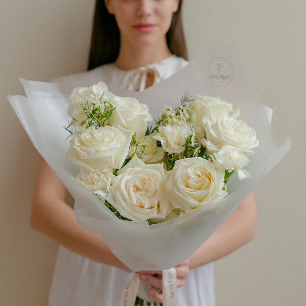 Роза Эквадор – 7 шт.Матрикария – 3 шт.Хамелациум – 1 шт.Упаковка дизайнерская – 1 шт.Гвоздика одноголовая – 5 шт.подкормка для срезанных цветов – 1 шт.любовь флориста – 100 шт.медиант ручной работы – 1 шт.советы по уходу за срезанными цветами – 1 шт.