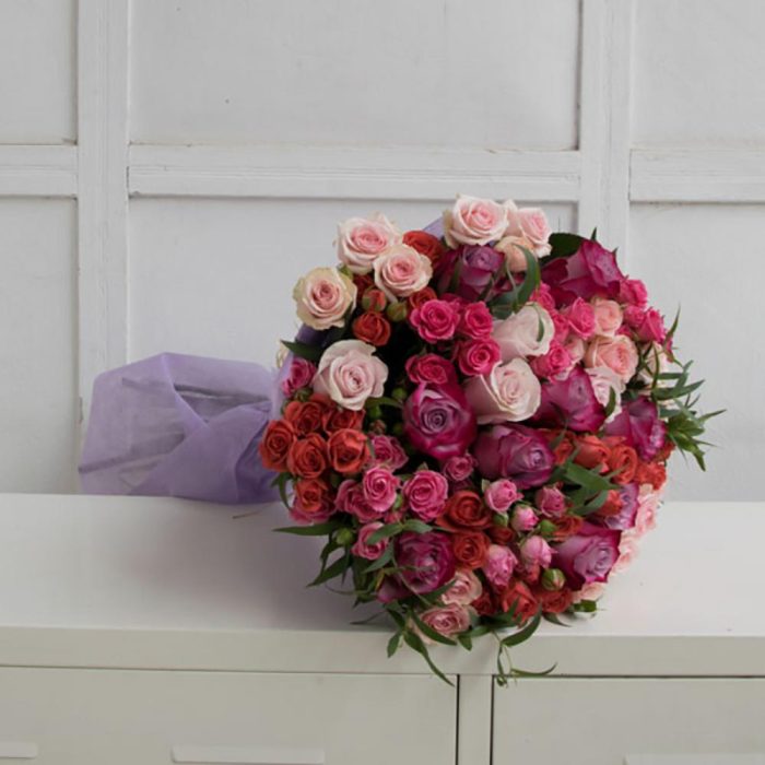 The flowers may vary and differ from the ones on the photo, although the colors will be maintained. Bouquet is colorful with pink, purple and dark pink roses.
