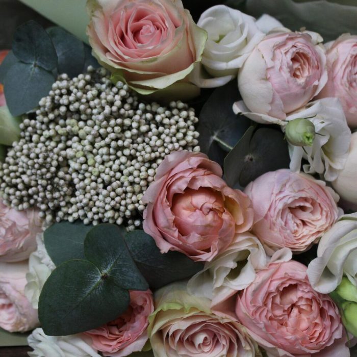 роза эквадор фруттето – 2 шт.Роза кустовая пионовидная джульетта – 1 шт.роза кустовая пионовидная мансфилд парк – 2 шт.Озотамнус – 1 шт.Эвкалипт – 1 шт.Эустома – 2 шт.Тишью – 1 шт.Пленка дизайнерская – 2 шт.