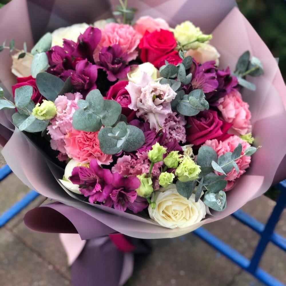 Альстромерии, Гвоздики, Кустовые розы, Лизиантусы, Розы, Хризантемы