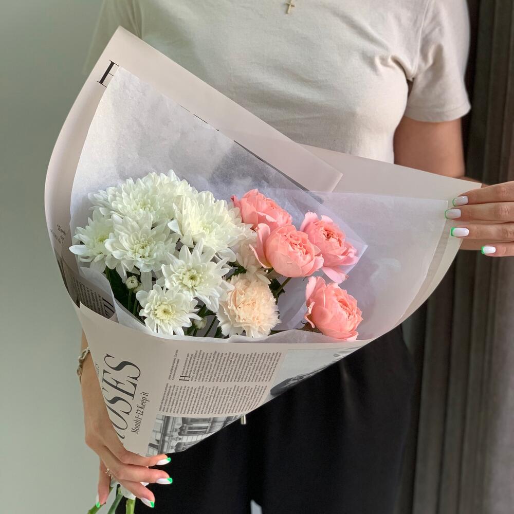 Альстромерии, Гвоздики, Кустовые розы, Лизиантусы, Розы, Хризантемы