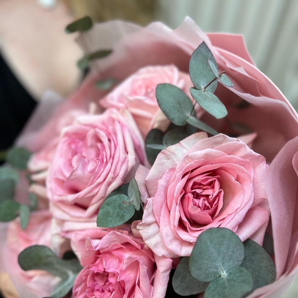 Эвкалипт – 2 шт.Лента атласная – 1 шт.Тишью – 3 шт.Фоамиран – 1 шт.роза пинк охара(ароматная) – 7 шт.