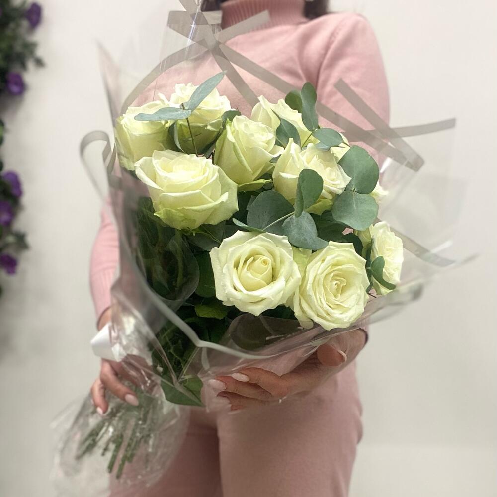 Роза Эквадор – 11 шт.Эвкалипт – 5 шт.Упаковка дизайнерская – 1 шт.Лента – 1 шт.