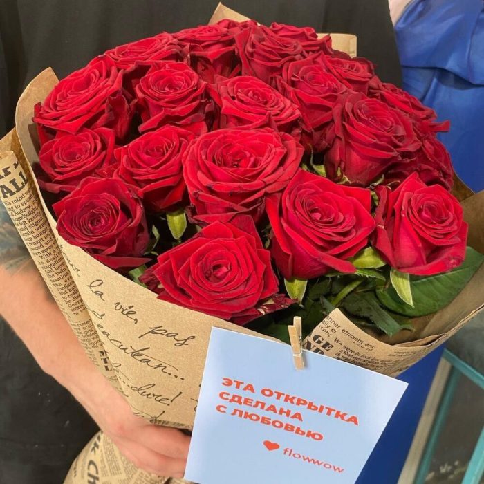 Лента атласная – 2 шт.Крафт – 3 шт.роза россия красная – 21 шт.