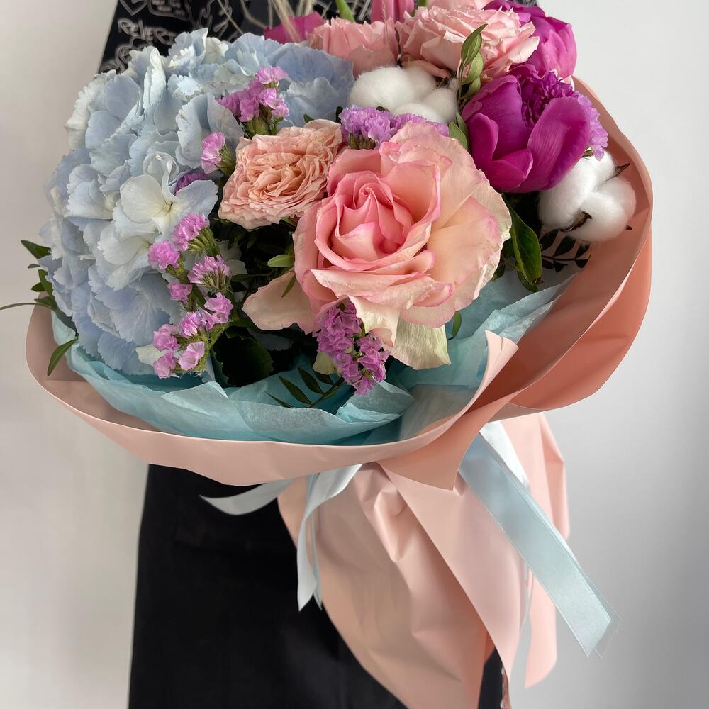 Букет из гортензии ,пиона ,тюльпана ,французская роза