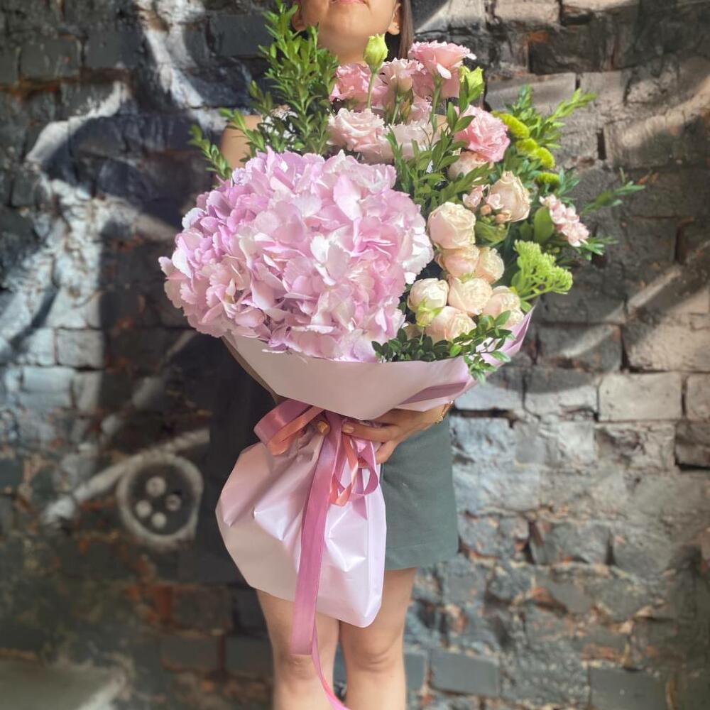 Букет из лизиантуса, гортензии, кустовой розы, эвкалипта и сезонных цветов “Маноло”