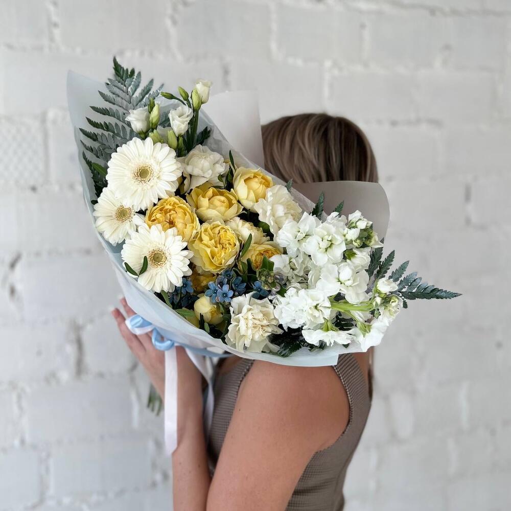 Маттиола – 3 шт.Папоротник – 2 шт.Гербера – 3 шт.Диантус – 3 шт.Фисташка – 5 шт.Оксипеталум – 2 шт.Упаковка дизайнерская – 3 шт.Пионовидная кустовая роза – 2 шт.эустома белая – 2 шт.