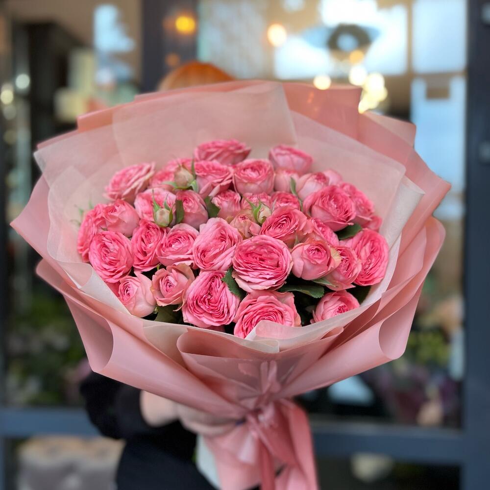 Атласная лента – 1 шт.Кустовая пионовидная роза – 9 шт.декоративная упаковка – 1 шт.