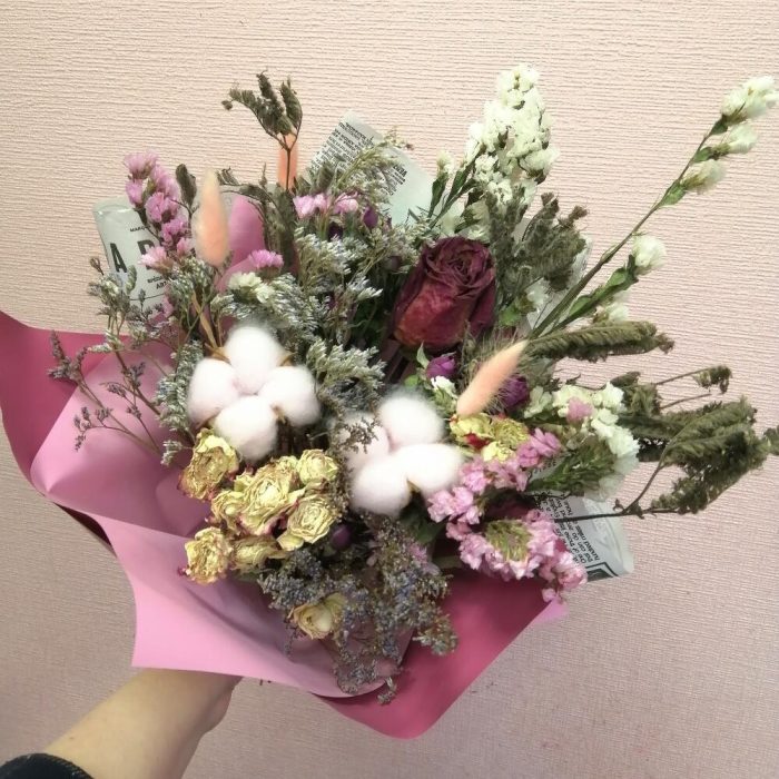 Статица – 3 шт.Хлопок – 2 шт.Колосья – 3 шт.Лимониум – 2 шт.Роза – 1 шт.Роза кустовая – 2 шт.Упаковка – 1 шт.