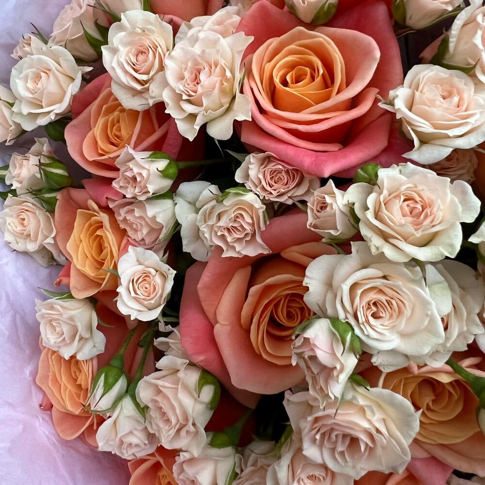 Роза кустовая 60 см – 16 шт.Роза коралловая 60 см – 15 шт.Дизайнерская упаковка – 5 шт.Тишью – 2 шт.Лента атласная – 2 шт.