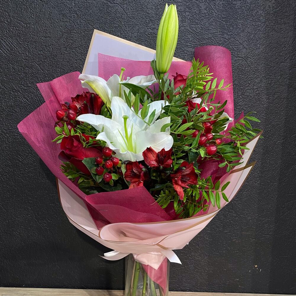 Лилия белая – 1 шт.Роза 50 см – 3 шт.Хиперикум красный – 3 шт.Альстромерия – 2 шт.Фисташка – 3 шт.Пленка матовая – 1 шт.Фетр – 1 шт.