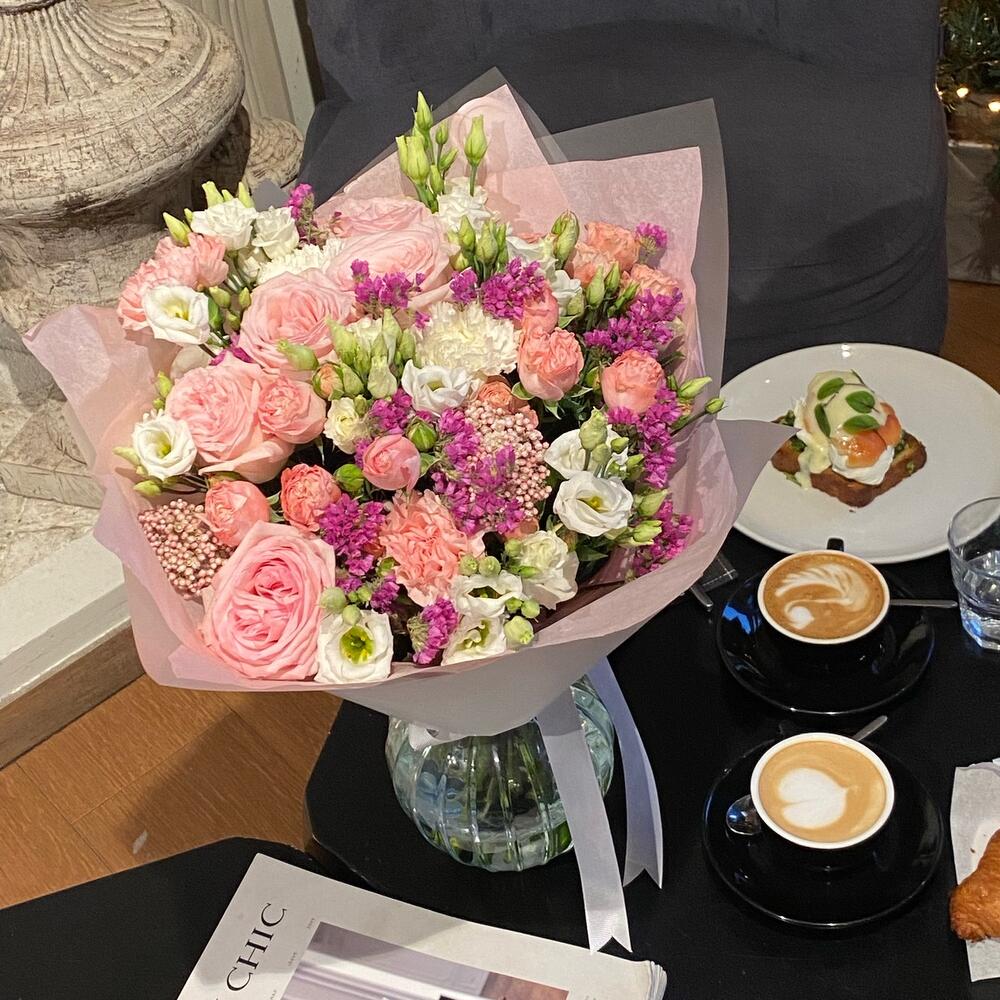 Озотамнус – 2 шт.Статица – 5 шт.Эустома – 5 шт.Фирменная упаковка – 1 шт.диантусы – 5 шт.madam bombastic – 3 шт.pink o’hara роза – 5 шт.