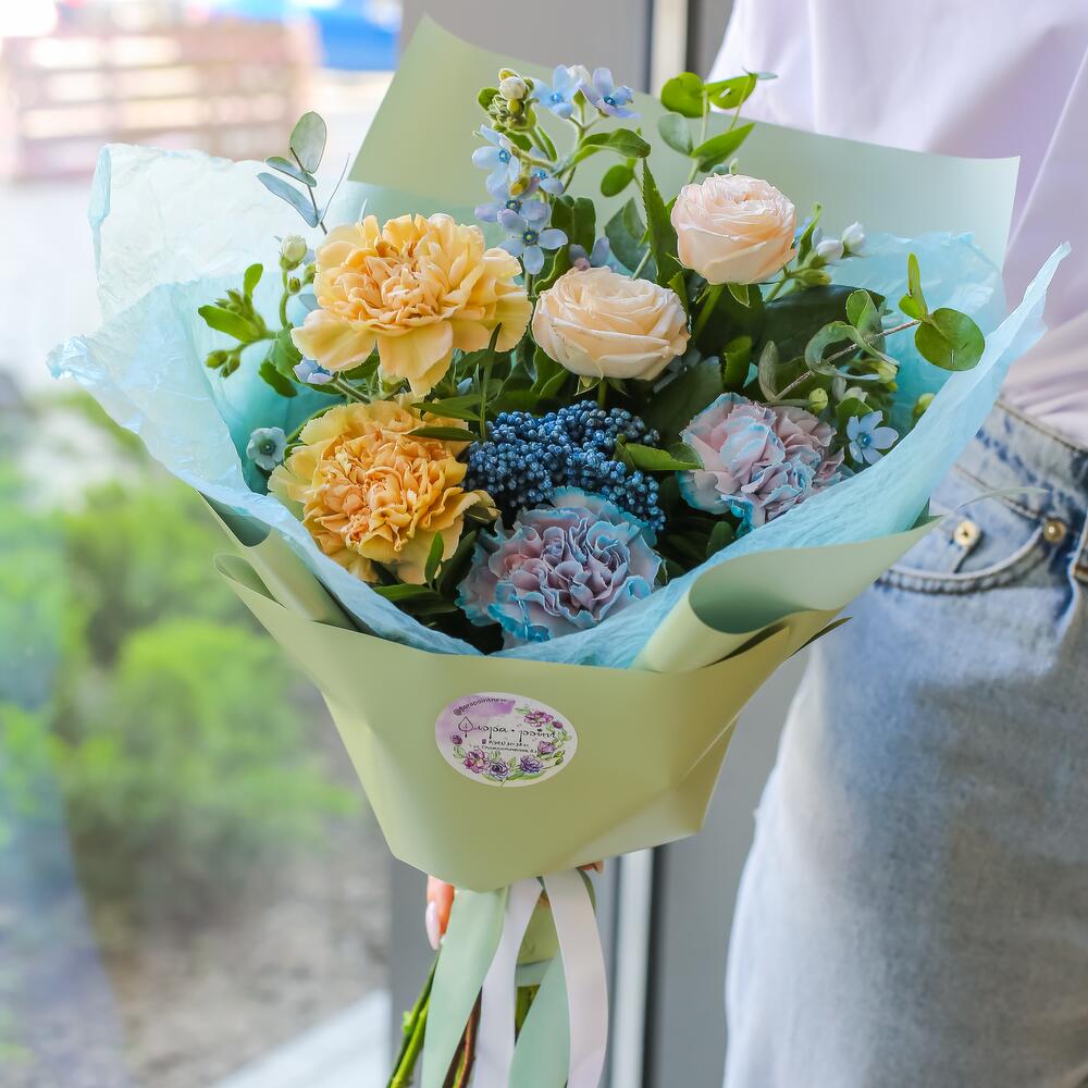 Гвоздика – 5 шт.Озотамнус – 1 шт.твидия голубая – 3 шт.Роза кустовая пионовидная – 1 шт.Эвкалипт ценерея – 1 шт.Упаковка дизайнерская – 1 шт.