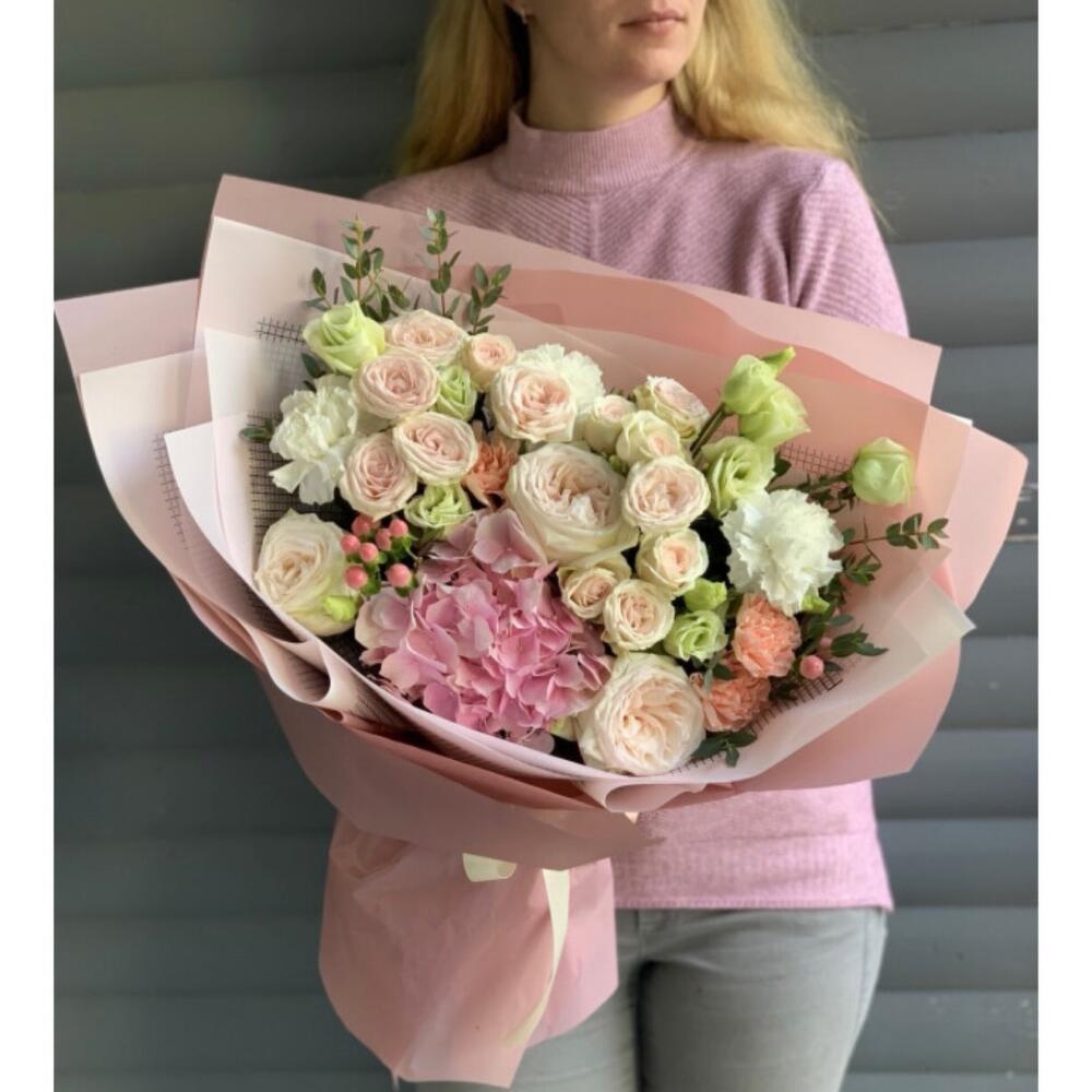 Альстромерии, Гортензии, Кустовые розы, Лизиантусы, Розы, Хризантемы