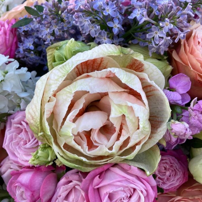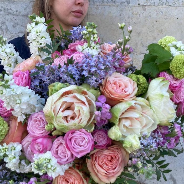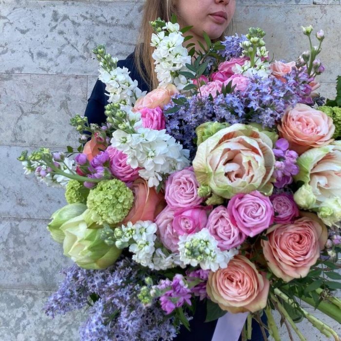 амариллисы – 3 шт.Роза пионовидная – 13 шт.Маттиола – 15 шт.Сирень – 5 шт.Вибурнум – 3 шт.Лента – 1 шт.