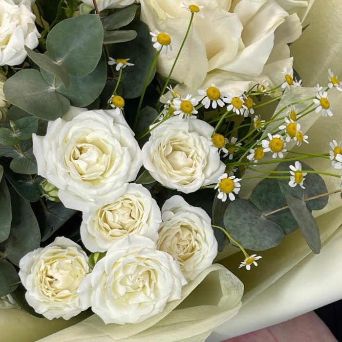 Маттиола – 1 шт.Эвкалипт – 2 шт.Роза – 3 шт.Кустовая роза – 2 шт.Лента атласная – 2 шт.Гербера – 2 шт.Матрикария – 2 шт.Фисташка – 3 шт.Упаковка дизайнерская – 2 шт.