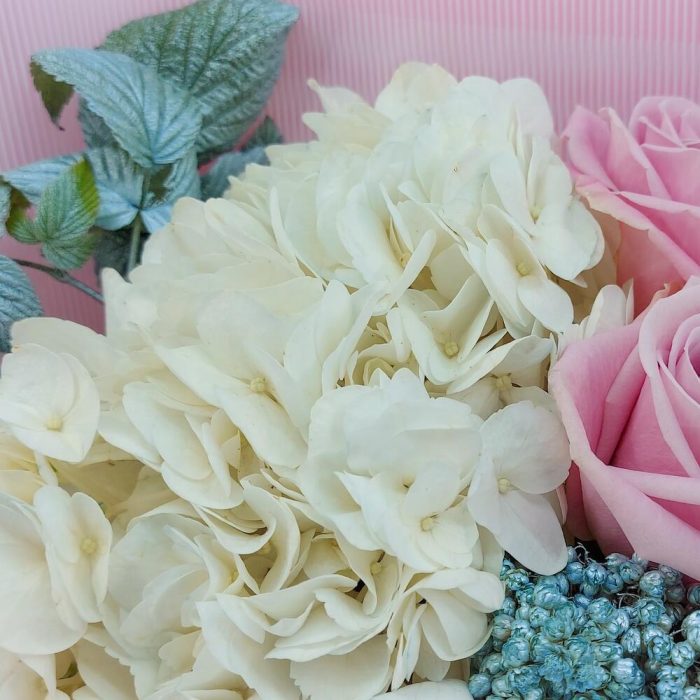 Гортензия – 1 шт.Озотамнус – 1 шт.Роза Эквадор – 5 шт.Упаковка дизайнерская – 1 шт.рубус зелень – 5 шт.