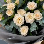 Лента – 2 шт.Эвкалипт – 2 шт.Упаковка дизайнерская – 2 шт.роза кустовая таня – 5 шт.