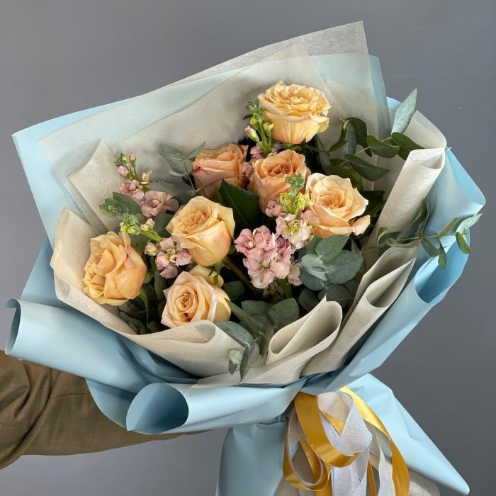 Лента – 1 шт.Маттиола – 5 шт.Эвкалипт – 2 шт.Упаковка – 1 шт.Роза шиммер – 7 шт.